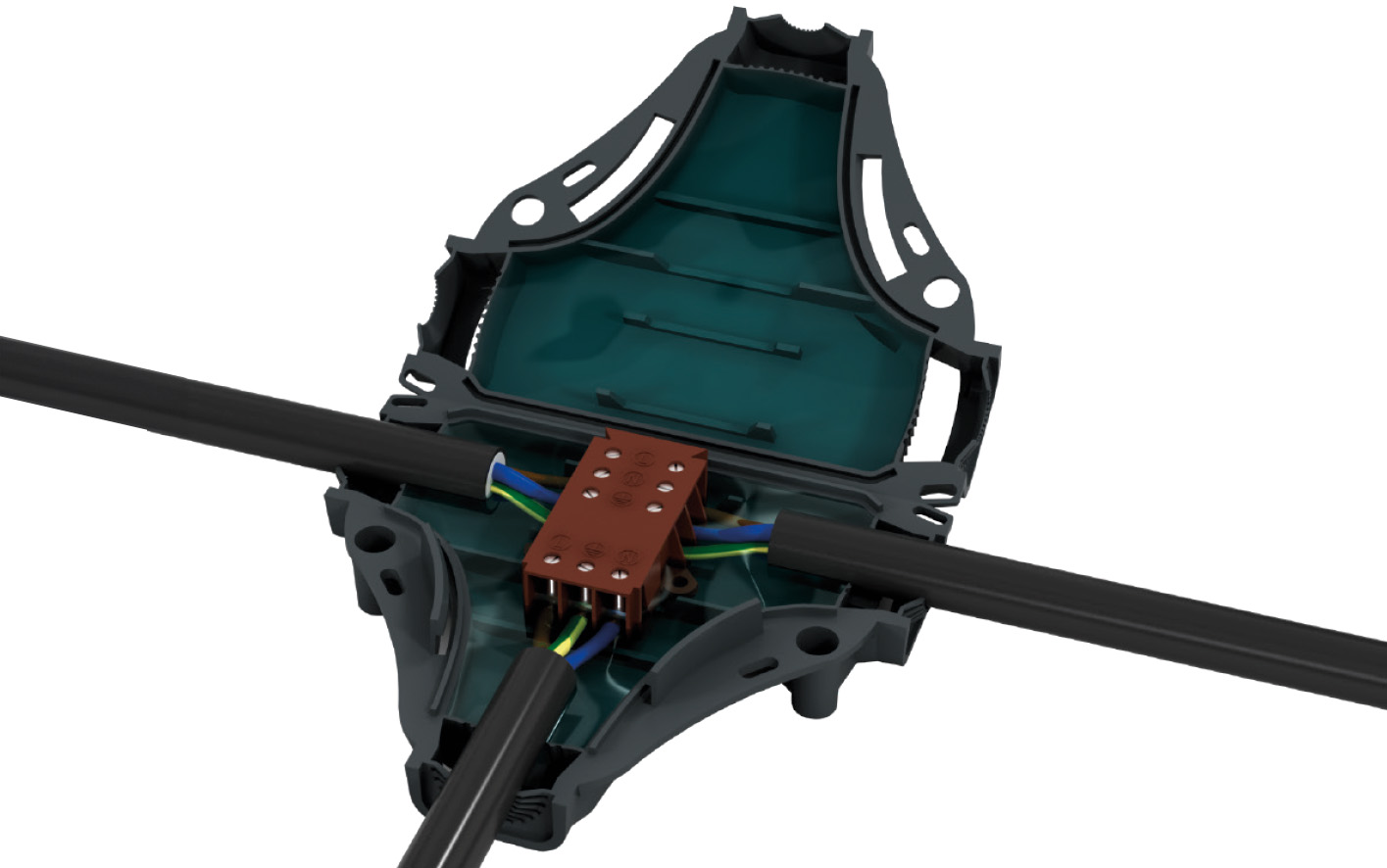 Spojka gelová EVO 03D pro odbočný spoj, se šroubovou svorkou 3x (1,5 - 4mm2), pro průměr kabelu 10-13mm, pro Cu/Al, jmenovité napětí 0,6kV/1kV, přímé spojení, rozměry: 105x90x28mm.