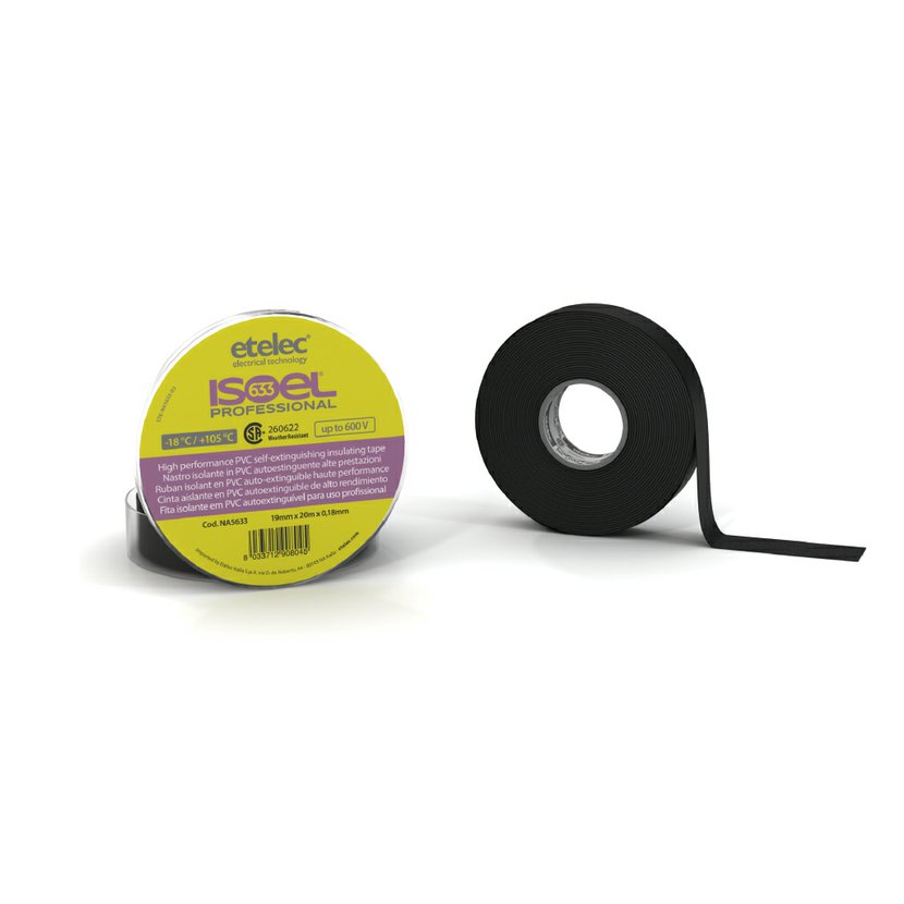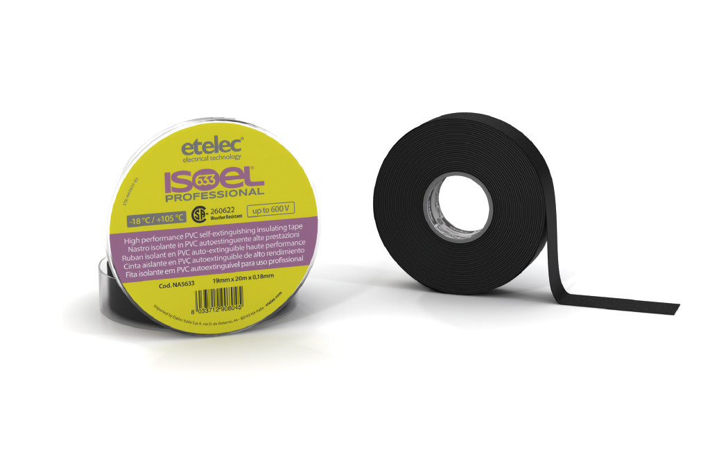 PVC izolační páska ISOEL 633 PROFESSIONAL NA5633 - ochrana pro kabely nízkého napětí až 0,6 / 1 kV. Použití při nízkých i vysokých teplotách (-18°C až +105°C). Vhodné pro použití jako primární izolace až 600 V. Splňuje normy EN 60454-3-1.